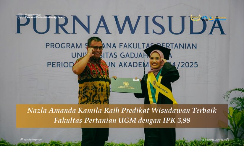 Yogyakarta, 28 Agustus 2025 — Prestasi membanggakan kembali ditorehkan oleh Nazla Amanda Kamila, mahasiswa Program Sarjana Ekonomi Pertanian dan Agribisnis, yang berhasil meraih predikat Wisudawan Terbaik Fakultas Pertanian Universitas Gadjah Mada dalam Wisuda Program Sarjana dan Diploma Periode IV Tahun Akademik 2024/2025. Dengan raihan Indeks Prestasi Kumulatif (IPK) 3,98, Nazla membuktikan dedikasi dan konsistensinya dalam menjalani studi di bidang ekonomi pertanian.