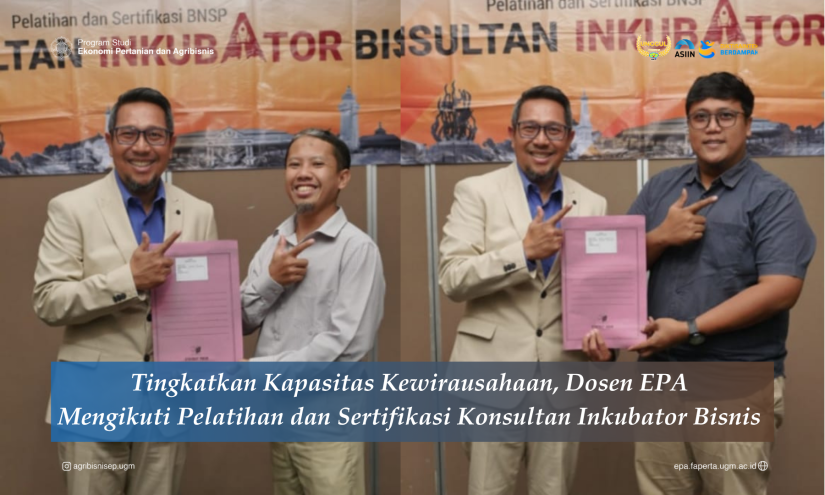 Dosen Program Studi Ekonomi Pertanian dan Agribisnis (EPA), Agus Dwi Nugroho, S.P., M.Sc., Ph.D. dan Arif Wahyu Widada, S.P., M.Sc., mengikuti Pelatihan dan Sertifikasi “Konsultan Inkubator Bisnis” yang diselenggarakan oleh Forum Manajemen Indonesia (FMI) di Yogyakarta pada 31 Juli – 2 Agustus 2025. Kegiatan ini menjadi bagian dari upaya pengembangan staf yang difokuskan pada peningkatan kompetensi dosen dalam bidang kewirausahaan dan pendampingan UMKM berbasis inkubator bisnis. Program pengembangan staf ini menjadi salah satu bentuk pelaksanaan Program Kompetisi Kampus Berdampak (PKKB) dari Pangkalan Data Perguruan Tinggi (PDDIKTI)